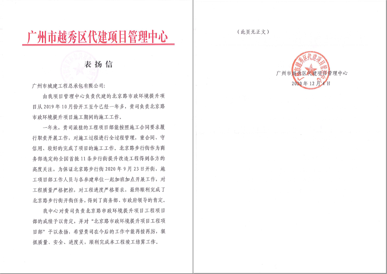 12月7日,廣州市越秀區(qū)代建項(xiàng)目管理中心向我公司發(fā)來表揚(yáng)信,對我公司負(fù)責(zé)的北京路步行街改造提升項(xiàng)目的施工工作予以肯定和表揚(yáng)。 項(xiàng)目自2019年10月開工,至今僅一年多的施工期間,我公司派駐的工程項(xiàng)目部按照施...