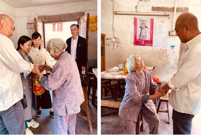 萬錦英老人家中有三口人,其 53歲的兒子在外打工的同時要照顧視力一級殘疾的孫子,所以老人在黎塘村老屋的家中常常是一個人居住,平時飲食起居全靠老人自己。蔡慶立同志駐村后經(jīng)常關(guān)心老人的身體生活狀況,噓寒問暖,甚至為老人量腳上網(wǎng)購買合適的鞋;老人屋后出入的木橋破舊,存在安全隱患,駐村工作隊為老人籌資修建了結(jié)實的鐵板橋和護(hù)欄。老人拉著前來探望她的陳蓉書記,眼含熱淚,對幫扶單位和駐村工作隊一再表示感謝。老人腰腿不好,我們離開時鎖好她家后門不讓她送,她堅持走出二樓門外,站在新修的鐵橋邊,依依不舍目送我們離開……